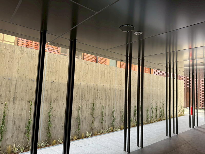 南、北、あわせて2カ所、鉄骨階段に下地を入れ、立ち上がった下地にパネルをノンシール工法で施工しました。 逃げのきかないノンシール工法で加工・施工できたのは、弊社の技術の向上になり、自信になりました。